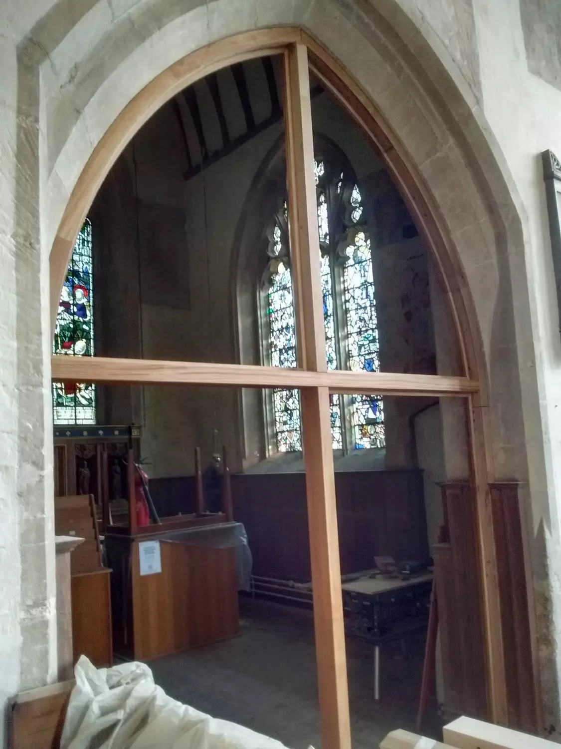 | Lady Chapel. Chancel flooring extended under the Lady Chapel arch. Joinery for the glazed screens installed. |