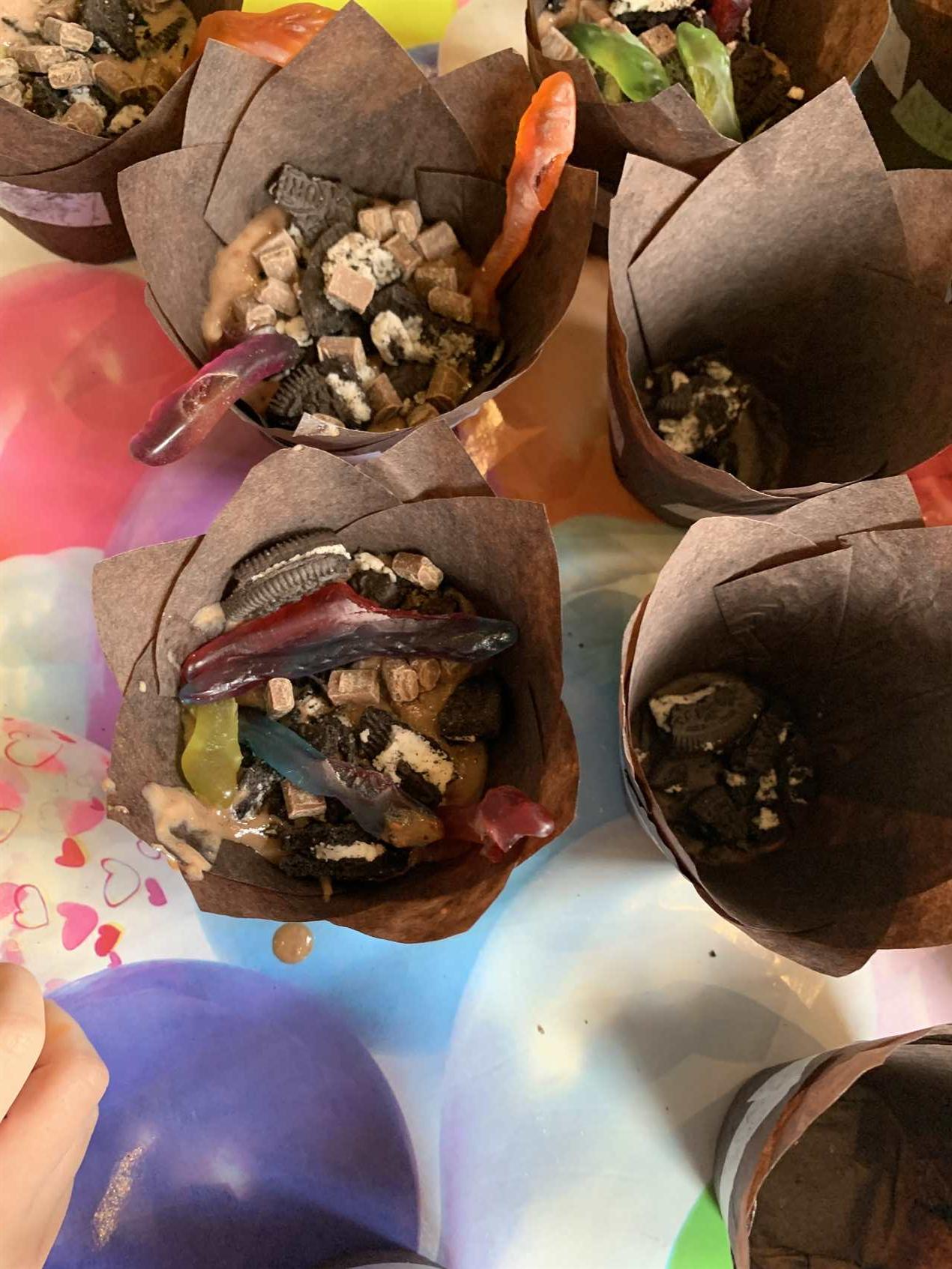Dirt and Worm cups with instant chocolate pud, milk, oreo biscuits, gummy worms